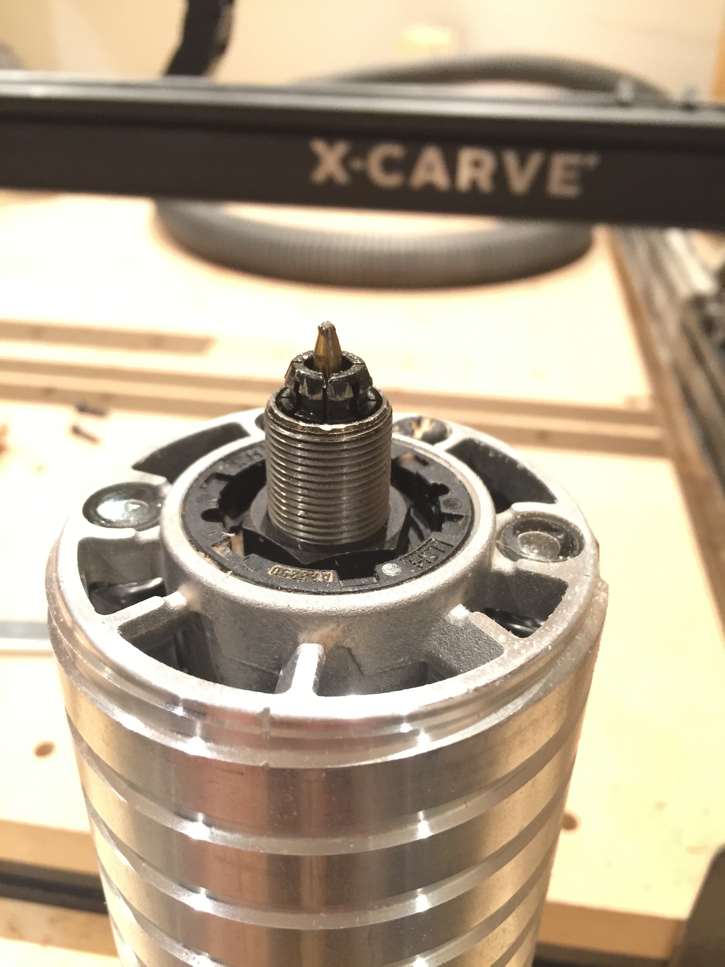The same thing just happened to me except my bit wasnāt initially broken. I was able to āvice gripā onto what little shank (actually the top of the āflutesā, if thatās the correct term) and gently move it side to side and the collet adapter came right out (it kind of popped out) although in the process I broke the bit, which I was willing to settle for as each of these bits costs just a dollar and fifty cents apiece and I didnāt want to ruin the collet adapter part itself (which is what I was afraid would happen if I used pliers to grab it). So, I guess Iāve now joined the ābroke a bitā club, but it was for a good cause! @PhilJohnson, where did you buy the $20 1/8" collet? I canāt see going through this process every single time I need to change my bitā¦