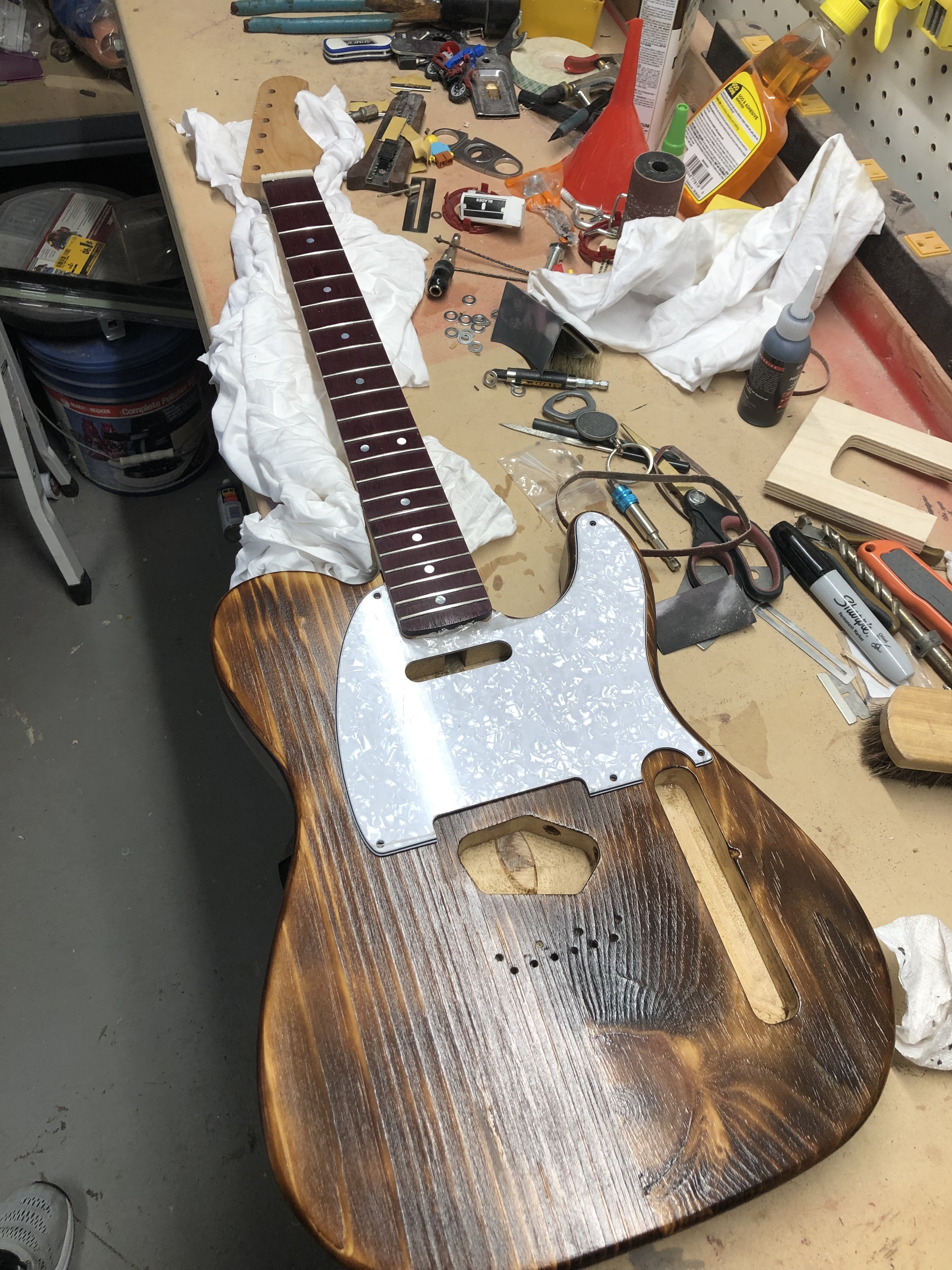 I upgraded my xcarve over the winter and decided to give this Vox Shadow inspired guitar a whirl on it. The XC did the neck carve, fretboard, body, and pickguard. I cut the slots on my fret slotting system, but scribed the locations with the XC.