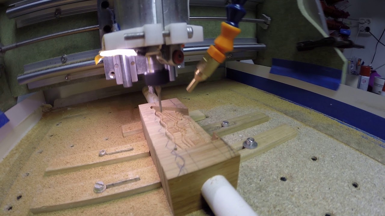 This image show the raw stock (bamboo) being carved, due to overall depth of cut (21mm) I only had one end mill that could reach so I went conservative on the feed & speeds. 3mm 2F used. First side being carved.