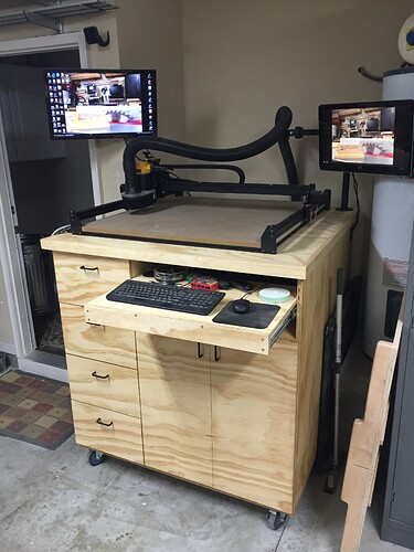 Just wanted to share my x-carve station with ya’ll, since I looked on here for inspiration before building, I’ll add mine to help others also. Simple 2x4 and 4x4 construction with pocket holes. Top is a 4’x4’ torsion box. Made a small shelf on the bottom out of some left over ash and a small box/shelf for the electronics. The feet are self leveling caster wheels from Amazon. I decided to move my PC down to the basement as well, in lieu of buying a new laptop.